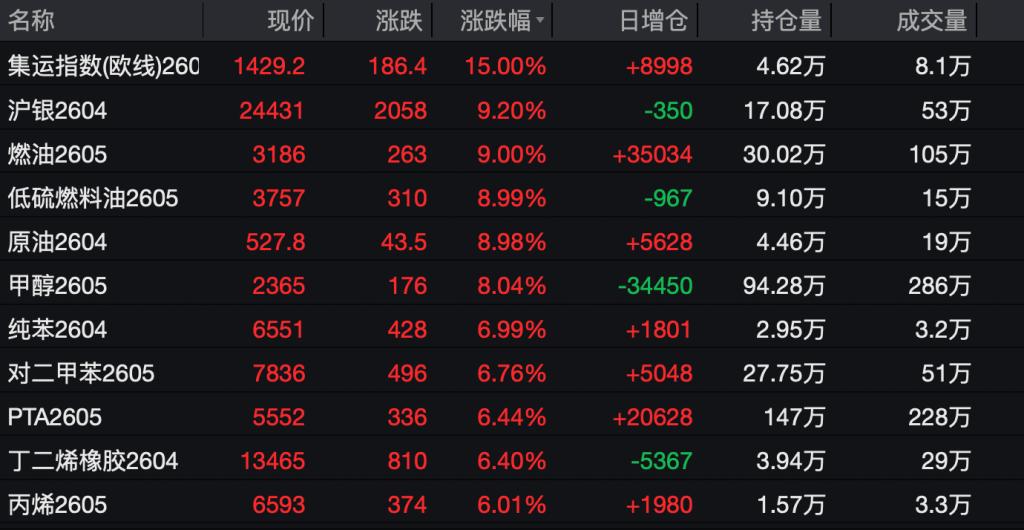 受周末美伊冲突影响,国内期货市场能化品种周一表现最为抢眼。截至3月2日收盘,国内期货市场能化品种迎来涨停潮,燃油、低硫燃料油、原油、甲醇、纯苯、丙烯、聚丙烯、乙二醇、液化石油气悉数涨停。