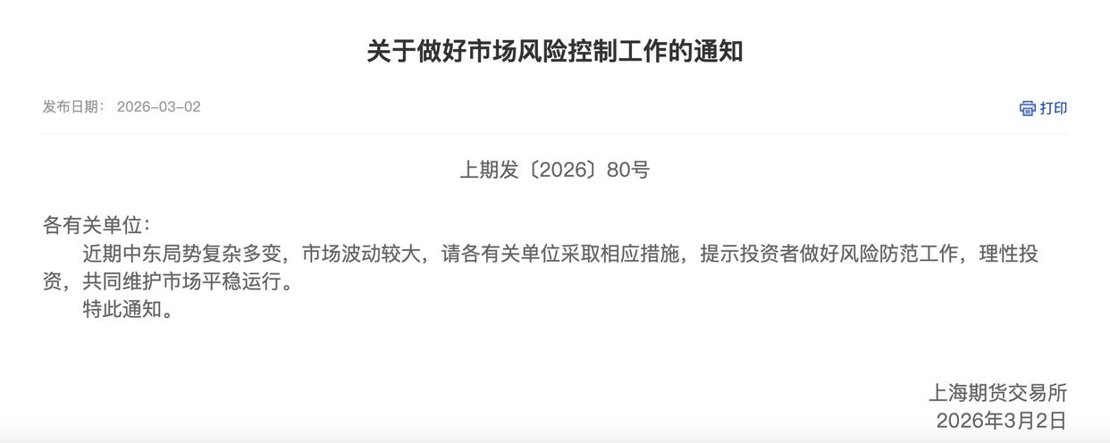 上海期货交易所及旗下上海国际能源交易中心发布通知称,近期中东局势复杂多变,市场波动较大,请各有关单位采取相应措施,提示投资者做好风险防范工作,理性投资,共同维护市场平稳运行。