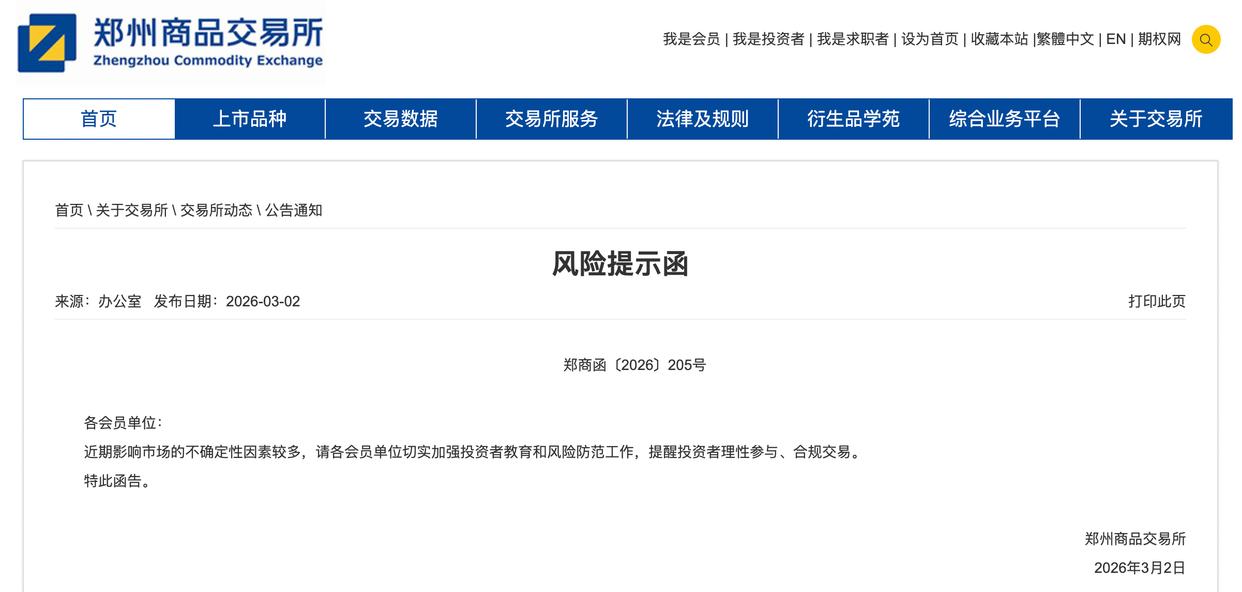 郑州商品交易所发布风险提示函称,近期影响市场的不确定性因素较多,请各会员单位切实加强投资者教育和风险防范工作,提醒投资者理性参与、合规交易。